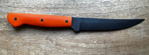 10.75” overall, 6” blade, Orange and black g10 handle, 80CRV2 steel, 1/8” thickness
