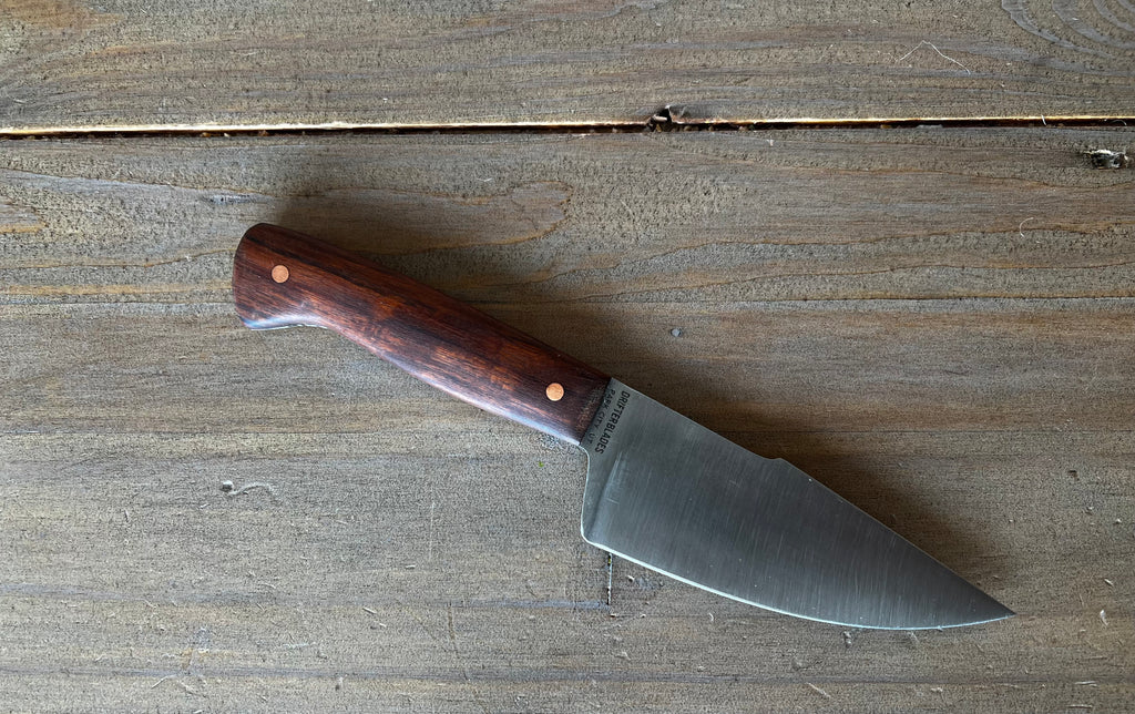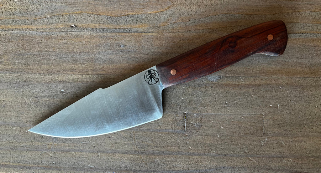 9.25” overall, 4.5” blade, desert ironwood with copper pins, nitro v steel