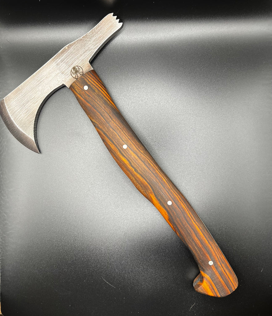 This tomahawk is a true hybrid. The scout tomahawk was designed for the individual demanding big performance from a lightweight package. Measuring 11.5” in height and made from .25” 80CRV2 carbon steel, this tomahawk is easily packable and light in hand. Handle material is a high contrast desert ironwood with stainless steel pins and a battle worn antiqued finish. From backcountry hiking, bushcraft or survival use, the scout hawk is truly a versatile tool.